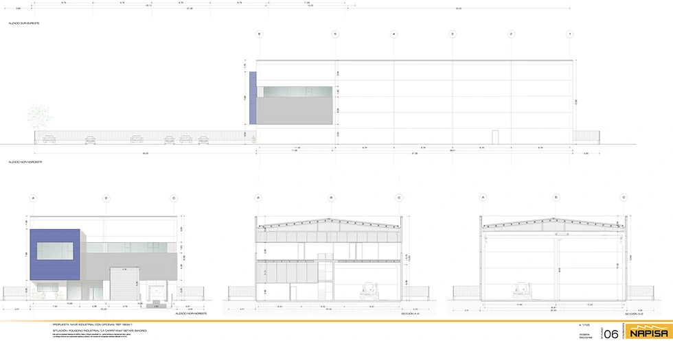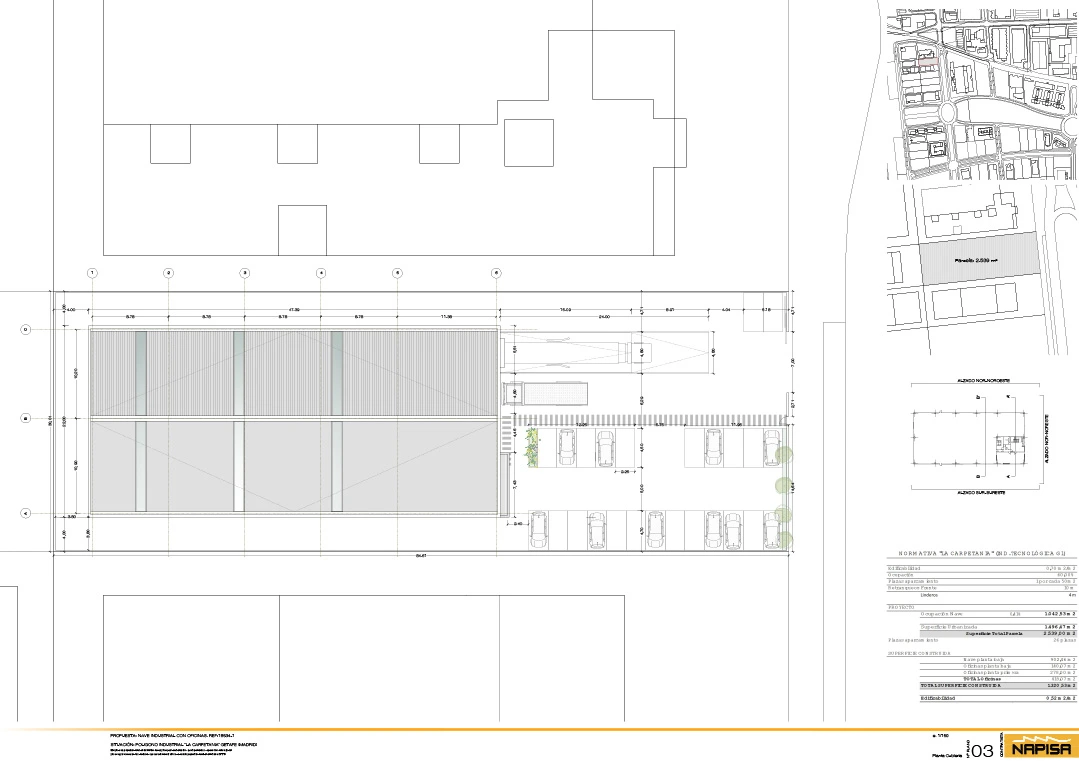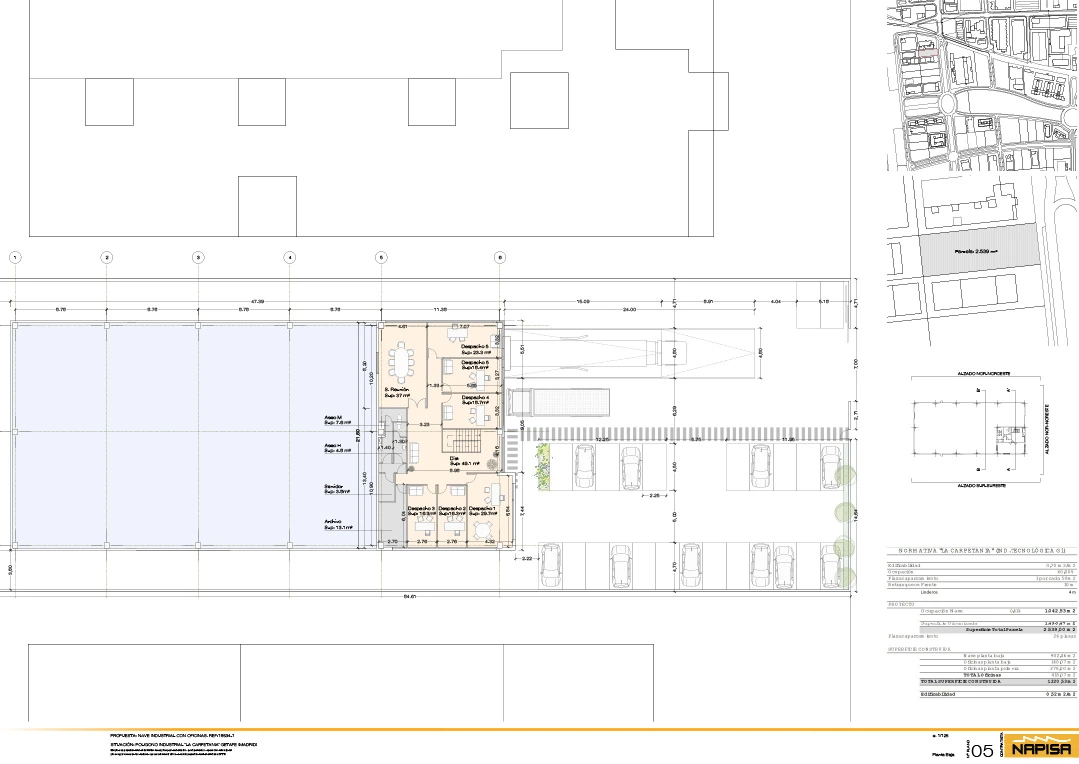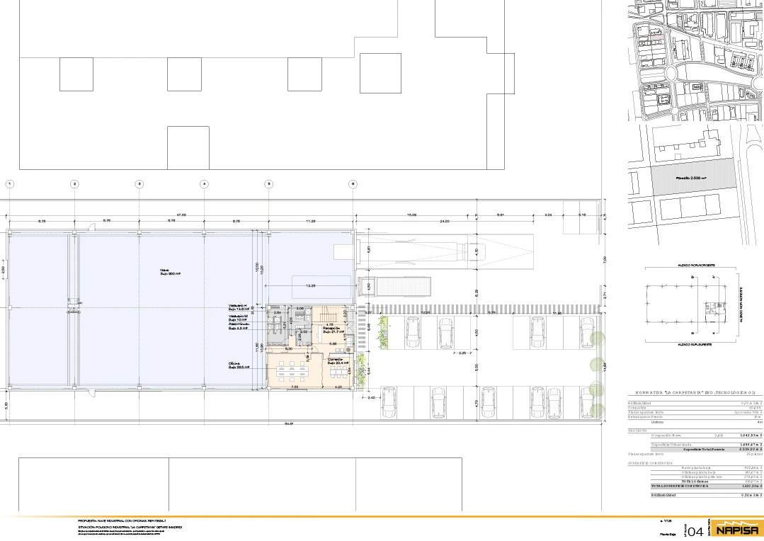 La implantación prevista contempla una ocupación en planta de 1.042,53 m² y 1.496,47 m² de superficie urbanizada, favoreciendo una distribución eficiente de accesos, circulación y maniobra. La nave en planta baja dispone de 902,46 m², mientras que las oficinas suman 418,07 m², repartidas en 140,07 m² en planta baja y 278,00 m² en planta primera.